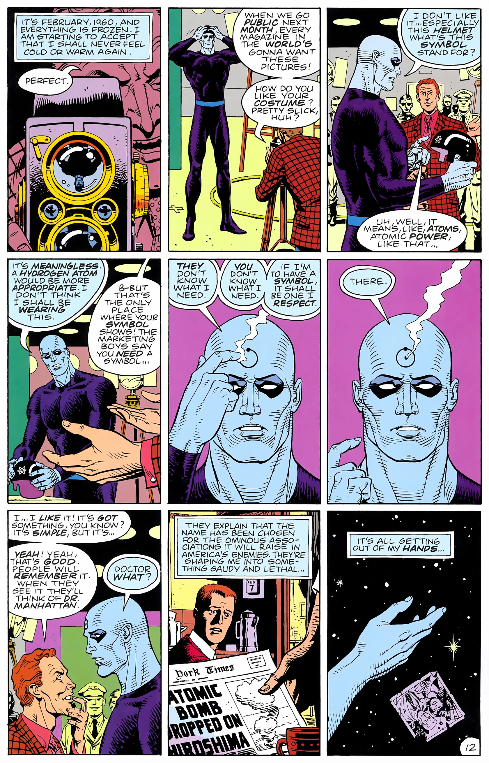 When the US drops the atomic bomb on Hiroshima, Jon is sixteen. His father, confronted with the undeniable facts of the theory of relativity, declares his profession outdated and throws his son's watch-making parts out the windows, urging him to instead pursue a career studying nuclear physics. The incident represents the turning point in Jon's potential future from watchmaker to nuclear physicist and foreshadows Doctor Manhattan's 'exterior' perception of time as predetermined and all things within it as so determined, including Doctor Manhattan's own reactions and emotions.